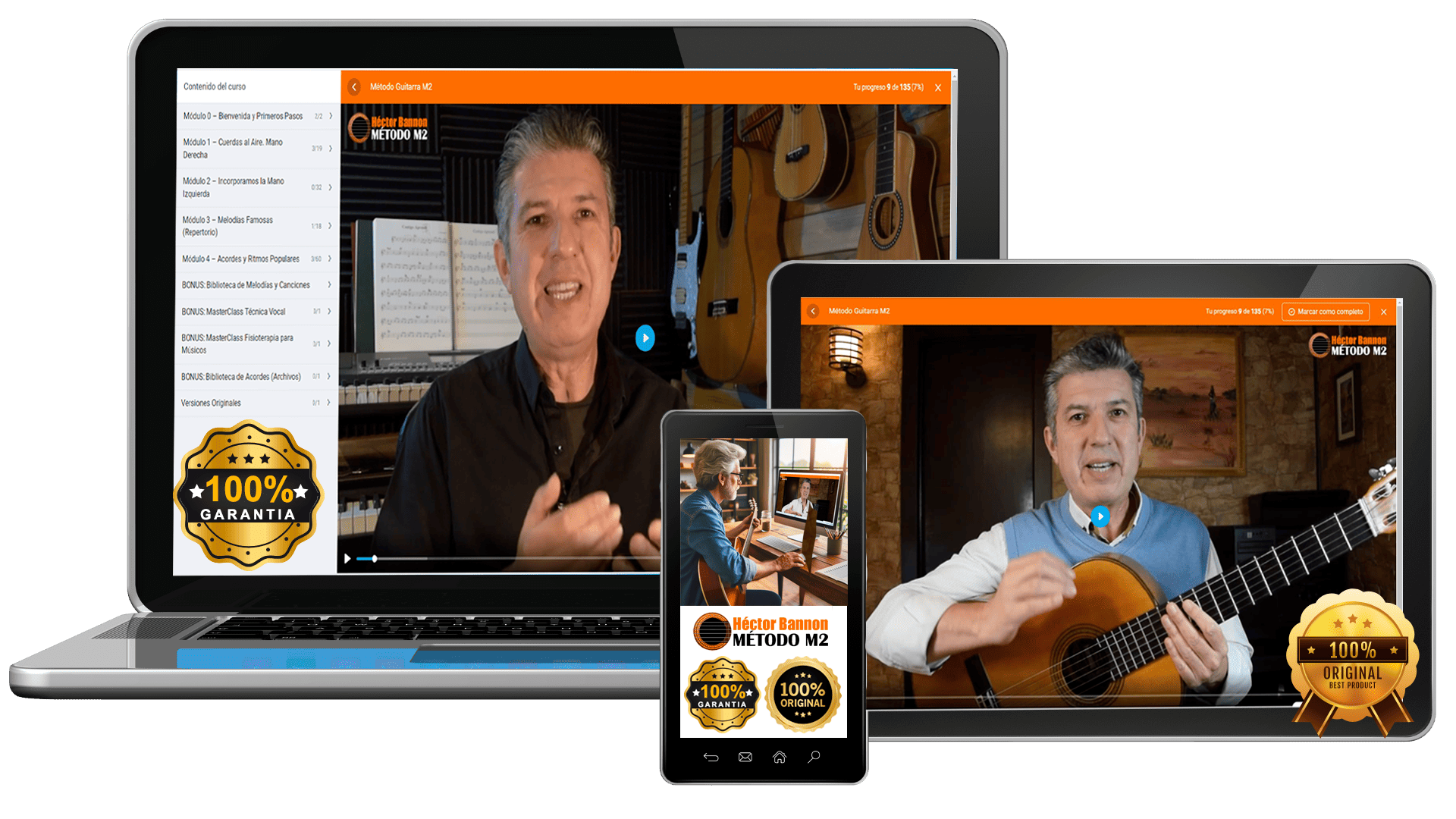 Nada de rodeos ni contenido de relleno, lo que contiene el Método Guitarra M2 es un paso a paso comenzando desde cero y llegando a tocar melodías famosas y tus canciones favoritas.